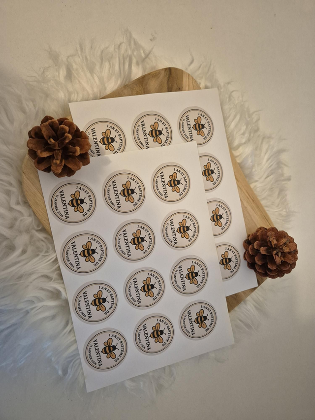 Jolie étiquette 4 cm de diamètre fond blanc mat décorative pour baptême, communion, naissance, profession de foi, première communion anniversaire, baby shower.
